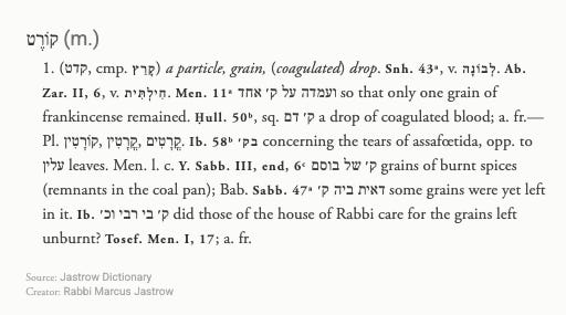 This English translation, while generally under Rav Steinsaltz’s direction, is probably off here. They render קוֹרֶט as “one pinch”. Meanwhile, Rav Steinsaltz’s Modern Hebrew translation is גוש קטן, a small lump or cluster. Similarly, the ArtScroll translation of קוֹרֶט is a “particle”, as opposed to a “fragment” (see their footnote), which would be the definition of less than one קוֹרֶט. ArtScroll and Rav Steinsaltz ztz”l in Hebrew are likely correct. And Jastrow says the same: