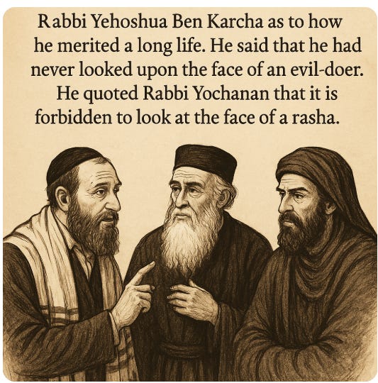 Thus, Rabbi (Yehuda HaNasi) asked Rabbi Yehoshua ben Korcha what he did to merit long life. Rabbi Yehoshua ben Korcha replied that he never gazed at the likeness of a wicked man. Further, Rabbi Yehoshua ben Korcha quoted Rabbi Yochanan that it’s forbidden to gaze at the face of a wicked man.