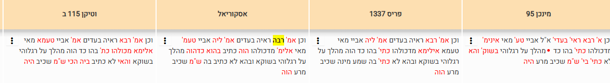 So again, the ones with “Rava” can be consistent with their earlier “Rava”, and Tosafot’s question can apply equally. The ones with “Rabba” that differed from their earlier “Rava” essentially answer Tosafot’s question, in that they don’t need to harmonize. This comparison is left as an excercise for the reader.
