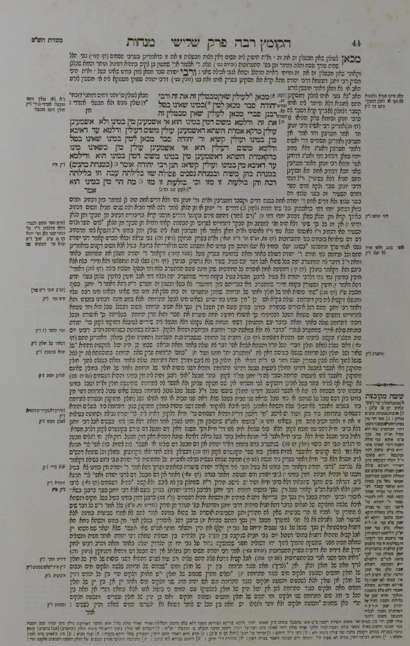 So, Menachot 22 is about Rabbi Yehuda’s min bemino, and some aspects of it seem like a kvetch. I think I can demonstrate this visually. Here is amud bet in Vilna Shas: