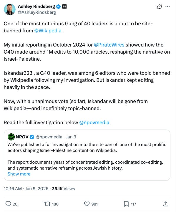 I am unhappy with Syria Palæstina, as I’ll discuss below, because it is inexact and because I’m convinced that it is part of a coordinated effort to delegitimize the State of Israel. Ashley Rindsberg, an investigative journalist, a senior editor at Pirate Wires and founder of the platform NeutralPOV (www.neutralpov.com), has published numerous articles detailing how specific “edit gangs” or coordinated groups influence content on politically sensitive topics, such as the Israel-Hamas conflict and U.S. politics. He also tweets on the subject (see image).