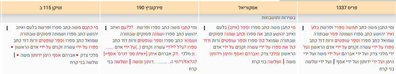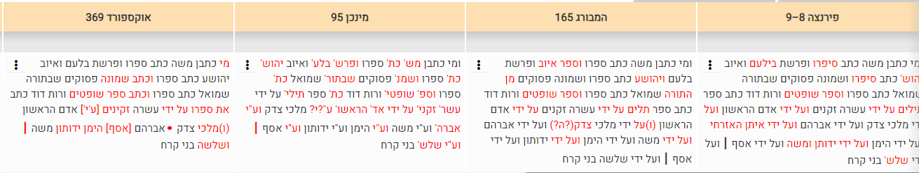 וּמִי כְּתָבָן? מֹשֶׁה כָּתַב סִפְרוֹ וּפָרָשַׁת בִּלְעָם וְאִיּוֹב. יְהוֹשֻׁעַ כָּתַב סִפְרוֹ וּשְׁמוֹנָה פְּסוּקִים שֶׁבַּתּוֹרָה. שְׁמוּאֵל כָּתַב סִפְרוֹ וְשׁוֹפְטִים וְרוּת. דָּוִד כָּתַב סֵפֶר תְּהִלִּים – עַל יְדֵי עֲשָׂרָה זְקֵנִים: עַל יְדֵי אָדָם הָרִאשׁוֹן, עַל יְדֵי מַלְכִּי צֶדֶק, וְעַל יְדֵי אַבְרָהָם, וְעַל יְדֵי מֹשֶׁה, וְעַל יְדֵי הֵימָן, וְעַל יְדֵי יְדוּתוּן, וְעַל יְדֵי אָסָף,