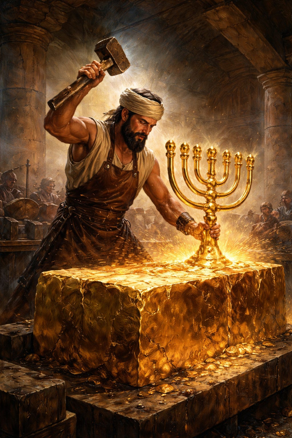 You shall make a lampstand of pure gold; the lampstand shall be made of hammered work; its base and its shaft, its cups, calyxes, and petals shall be of one piece.