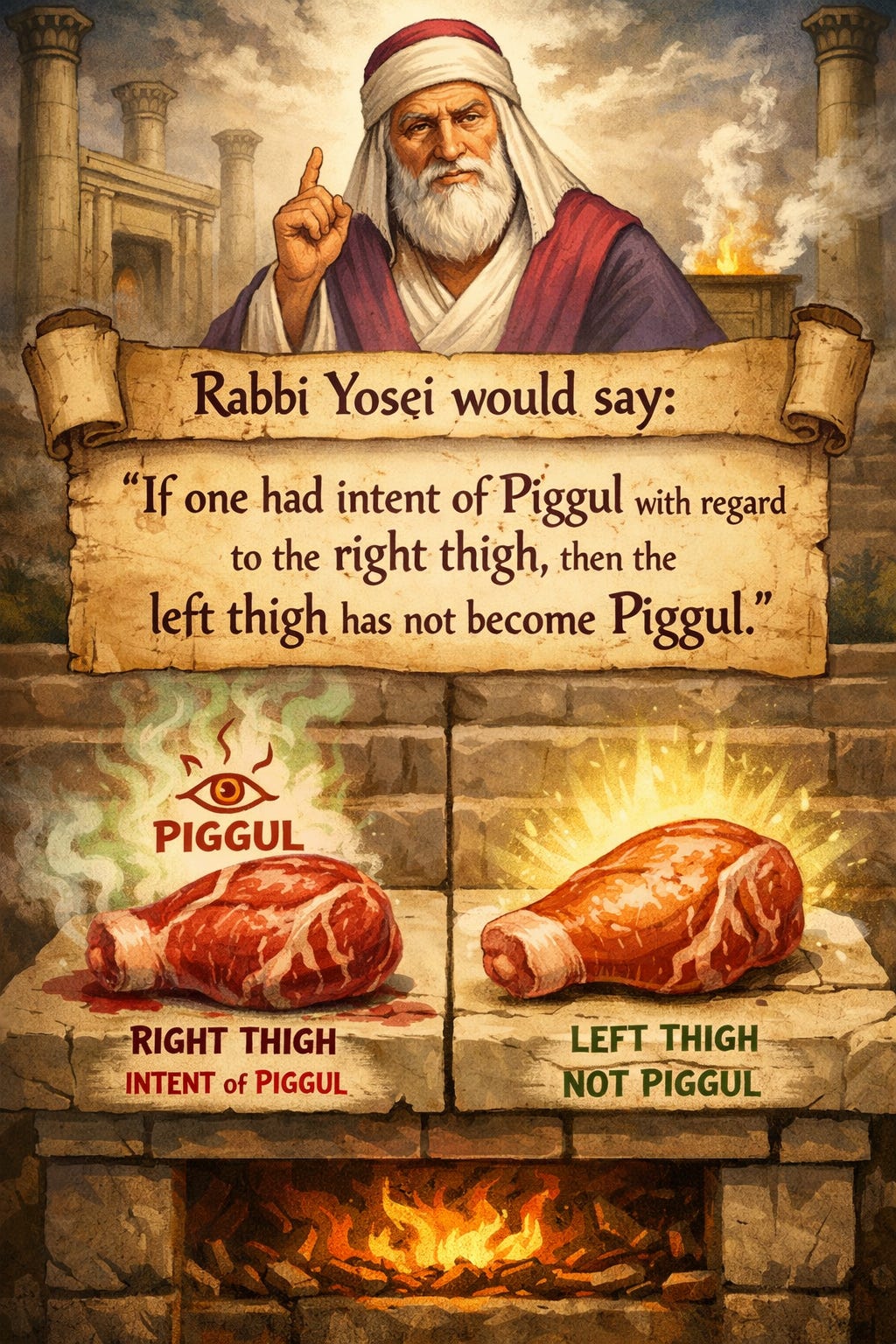 GEMARA: Rav Huna says: Rabbi Yosei would say, in accordance with his opinion that intent of piggul with regard to one loaf or one arrangement does not render the second loaf or arrangement piggul, that if one had intent of piggul with regard to the right thigh, i.e., he slaughtered an offering with the intent to partake of the right thigh the next day, then the left thigh has not become piggul and one is not liable to receive karet for its consumption. What is the reason for this? If you wish, propose a logical argument, and if you wish, cite a verse.