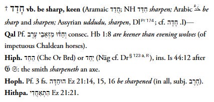 But usually, with a dagesh in a letter immediately following a vowel, we would interpret it as a dagesh chazak, geminating the letter. Instead of chedvah, joy, we get chaddad, חִדּוּדִים, goosebumps. That’s Shmuel. Rav connects it to sharp. This is also from the root חדד, sharp. Note the geminating dagesh in חֶרֶב חַדָּה.